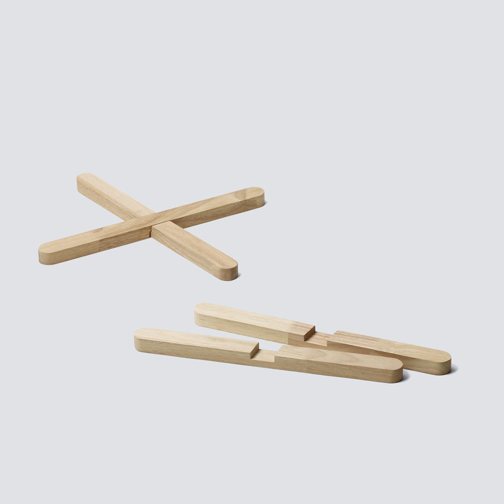 鍋敷きは2本の木を組み合わせる設計で、コンパクトに収納可能。自宅はもちろん、アウトドアでも手軽に本格鉄板焼きを楽しめます。